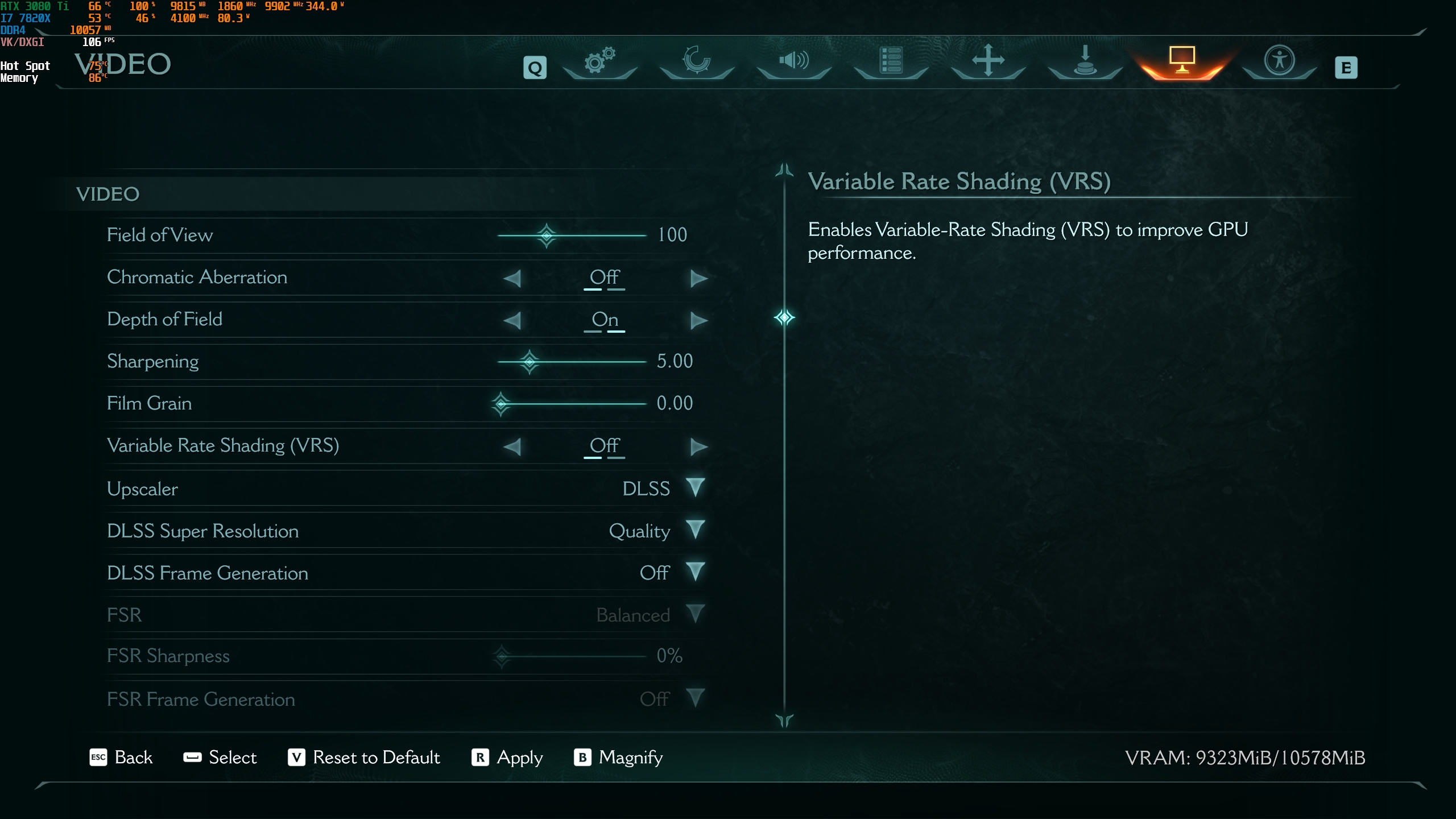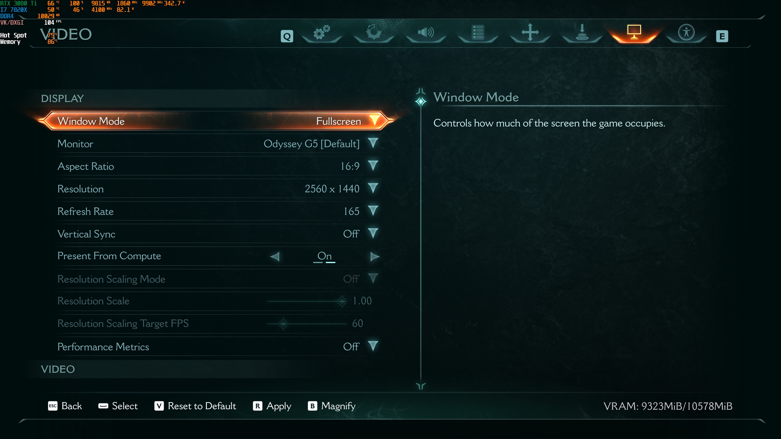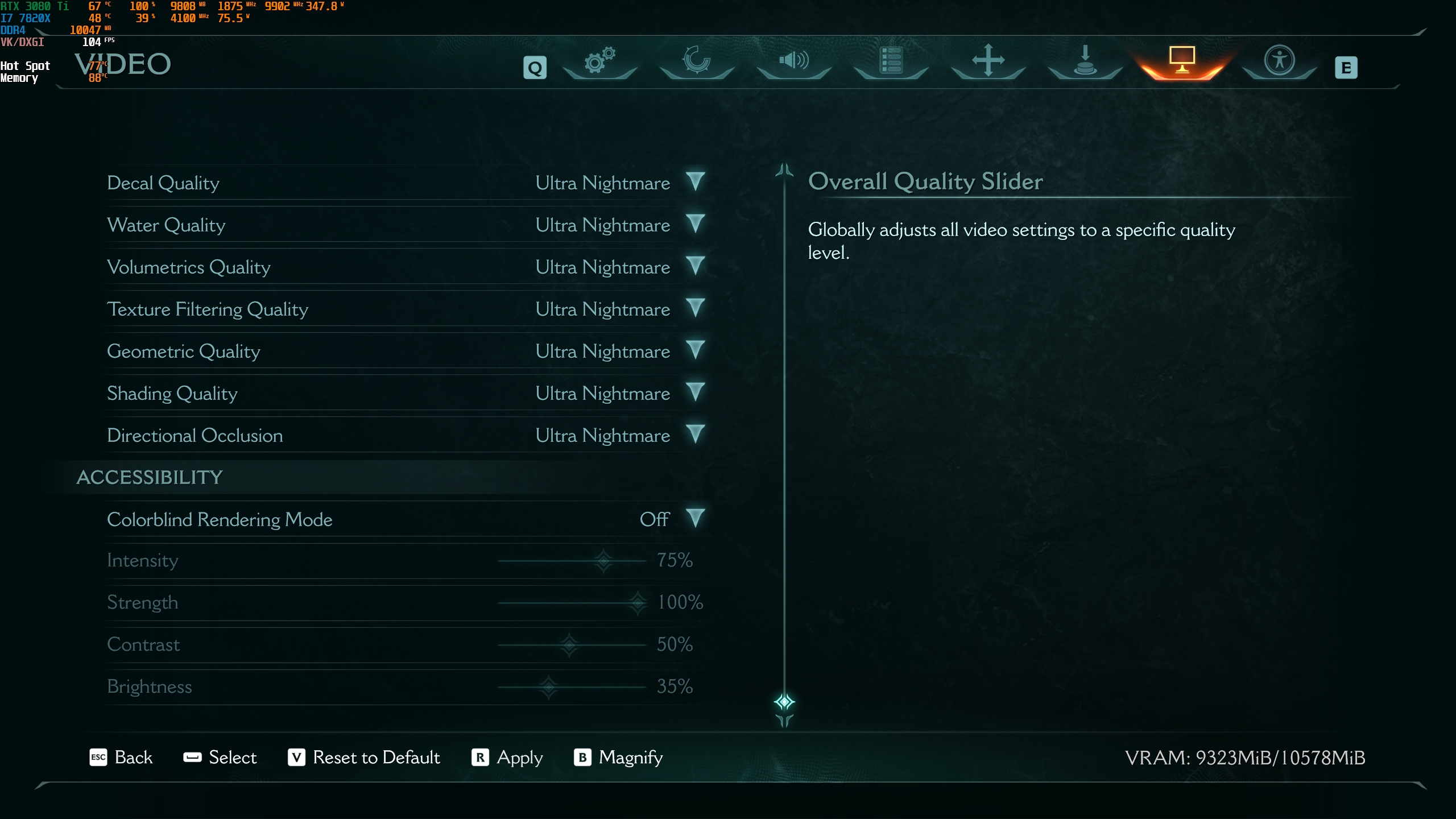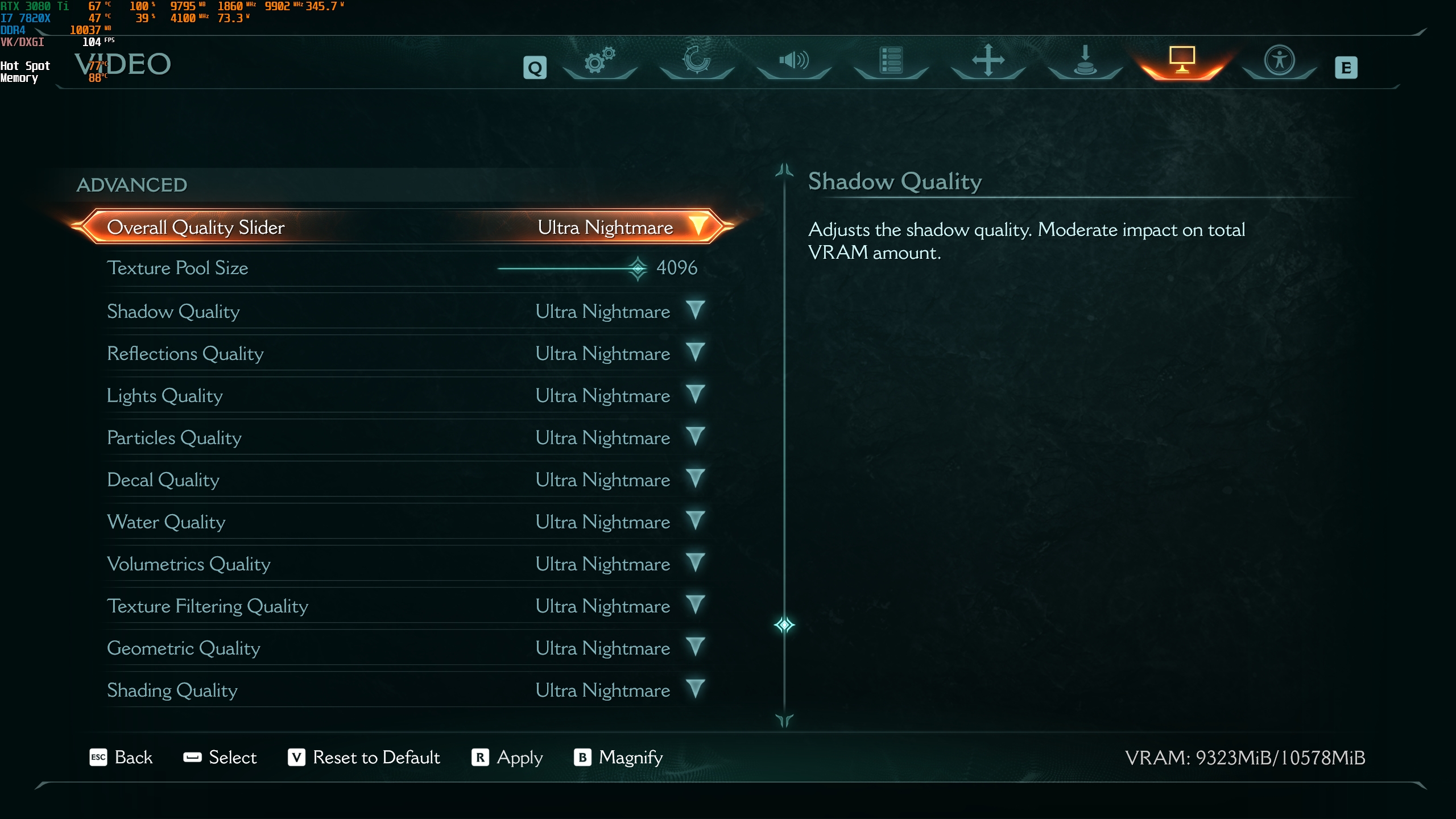 1440p, Ultra Nightmare, DLSS Quality 110-126 FPS néhol van 80-90 fps, Texture Pool Size 4096-on.